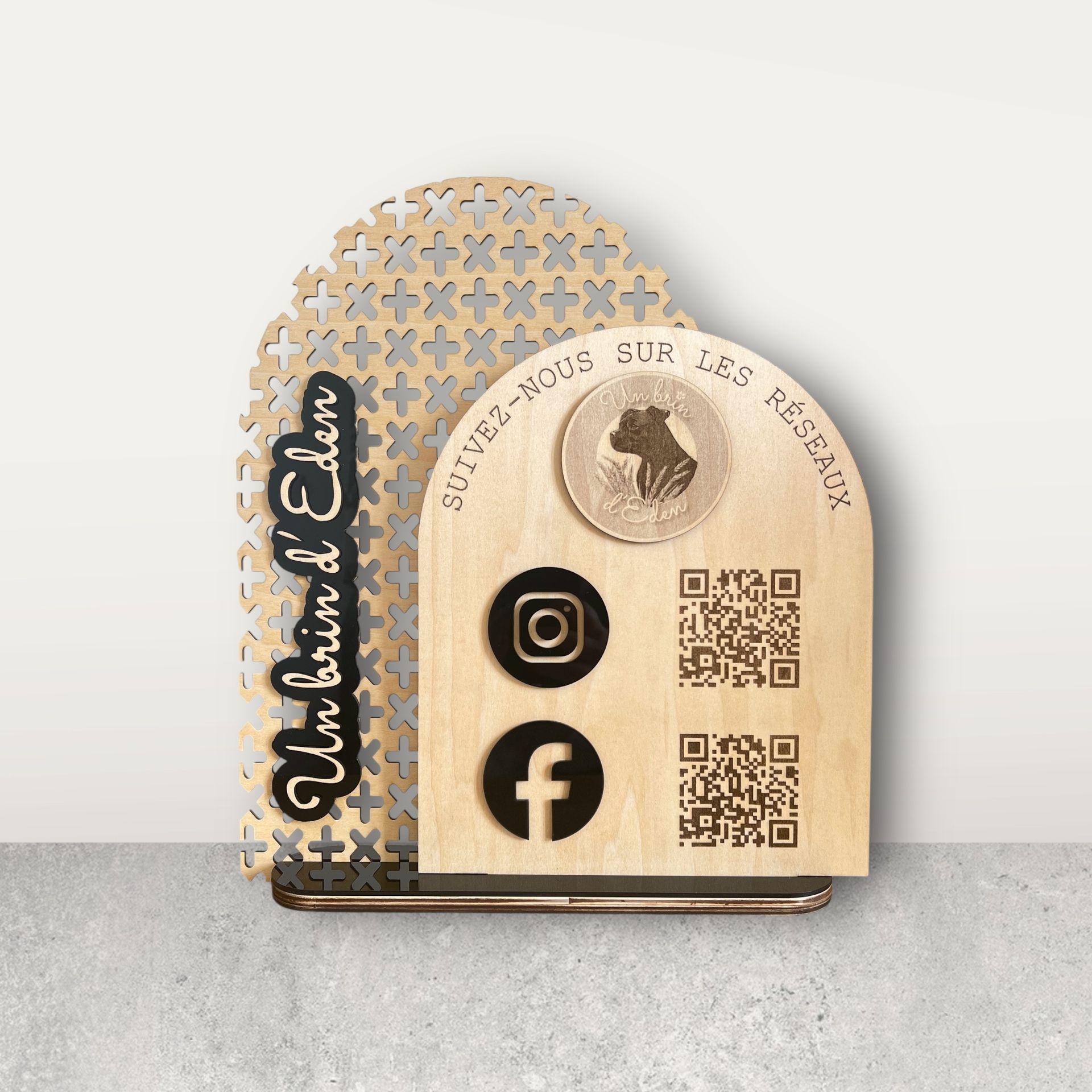- Personnalisation incluse : Gravure de 1 à 3 QR codes, intégration du logo en relief et réseaux sociaux.